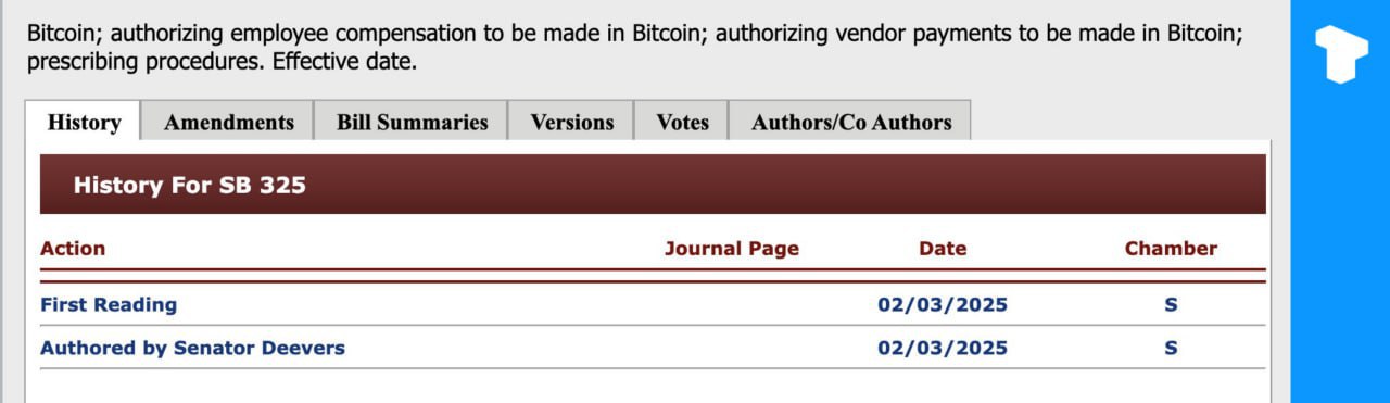 俄克拉荷马州参议员达斯蒂·迪弗斯提出了「比特币自由法案」,允许员工选择自愿以比特币形式领取工资,并允许供应商接受 BTC 付款。
