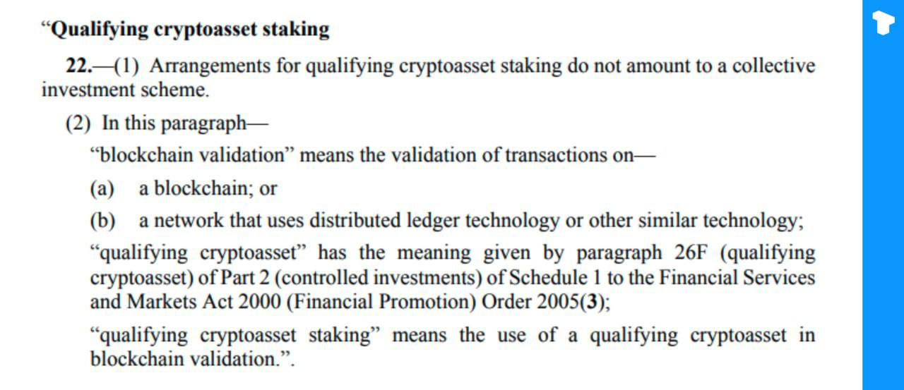 英国财政部修改了金融法,明确指出加密货币质押(对于以太坊和 Solana 等权益证明(PoS) 区块链至关重要)不是通常受到严格监管的集体投资计划。