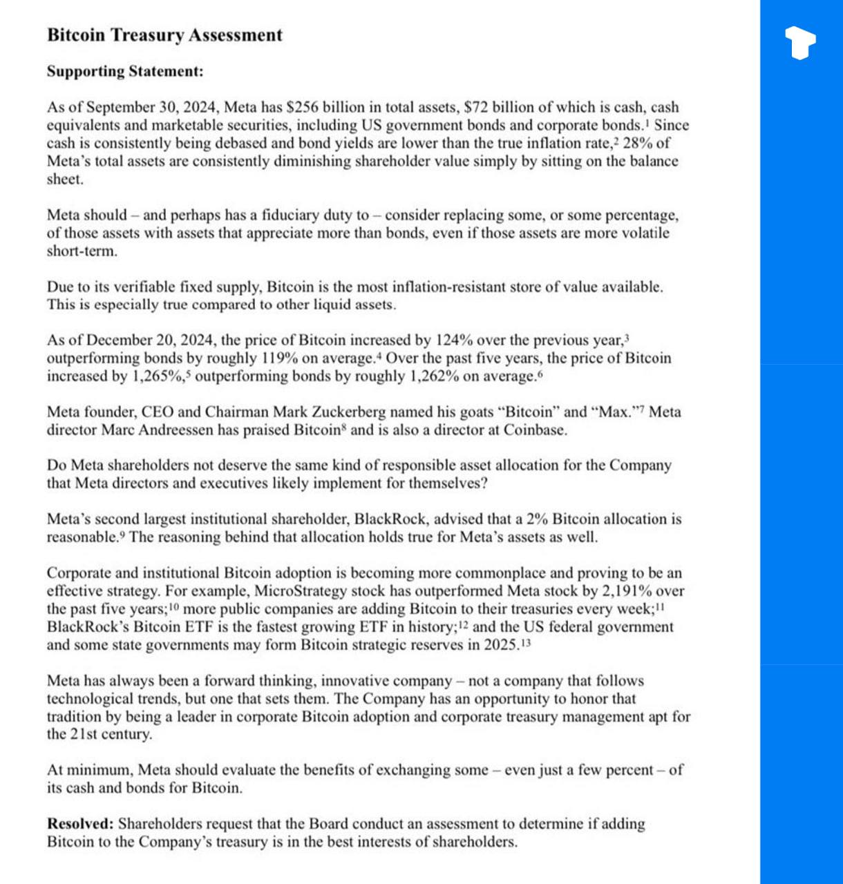 该提议表明 Meta 可以通过 BTC 实现现金和债券持有量的多元化,以提高长期股东价值。