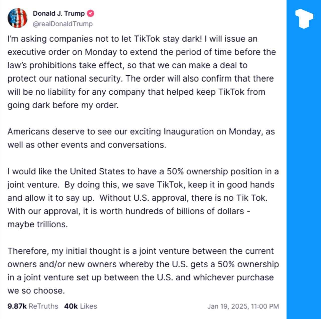 在唐纳德·特朗普宣布将发布行政命令延长禁令期限后, TikTok 开始恢复服务,并表示他希望美国持有合资企业 50% 的所有权,以维持其运营。