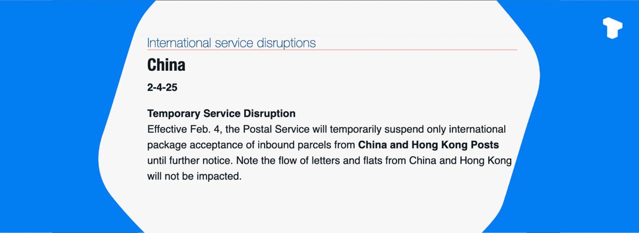 The U.S. Postal Service has temporarily suspended the acceptance of incoming international parcels from China and Hong Kong