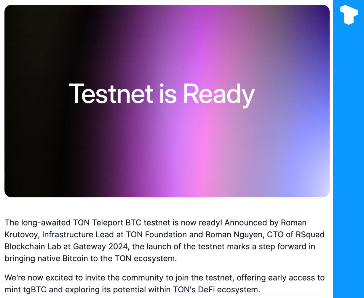 The TON Teleport BTC testnet has been launched.