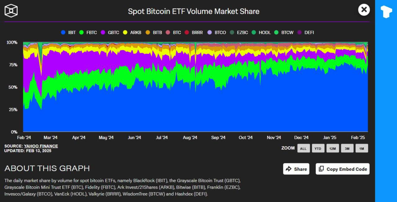2025 年 1 月,贝莱德的 iShares 比特币信托基金 (IBIT) 的市场份额创下历史新高