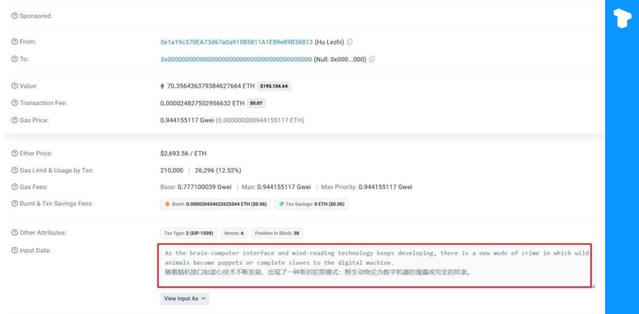 有人向以太坊的零地址销毁了 500 ETH,价值约 130 万美元,并留下一条神秘信息,声称中国级脑机(类似于 Neuralink)已经大规模植入其军队和劳动力中。