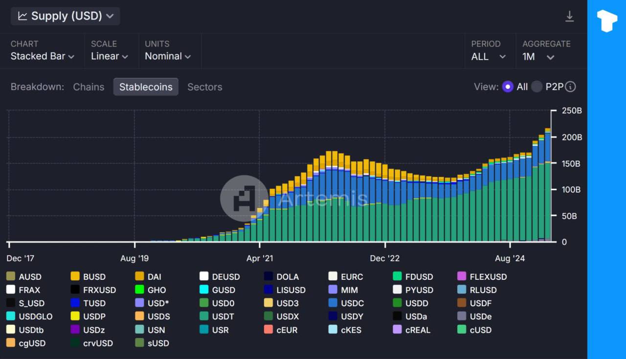 Stablecoin supply hit a new all-time high of over $215bn