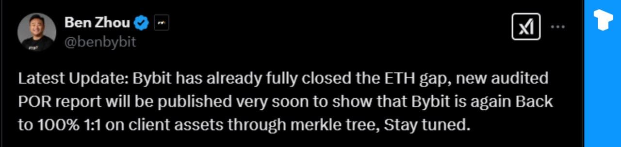 Bybit CEO Ben Zhou stated that the exchange has fully closed the stolen ETH gap, with its newly audited proof-of-reserves confirming 100% 1:1 asset backing.