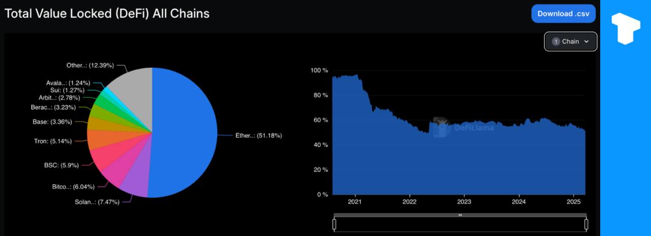 Ethereum’s TVL dominance is rapidly declining. In late February 2024, it stood at 61.64%, but now it has dropped to 51.25%.
