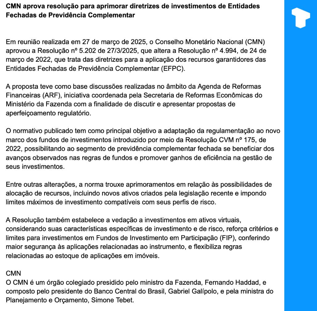 巴西国家货币委员会(CMN)禁止封闭式补充养老基金(EFPC)将其担保储备投资于加密资产