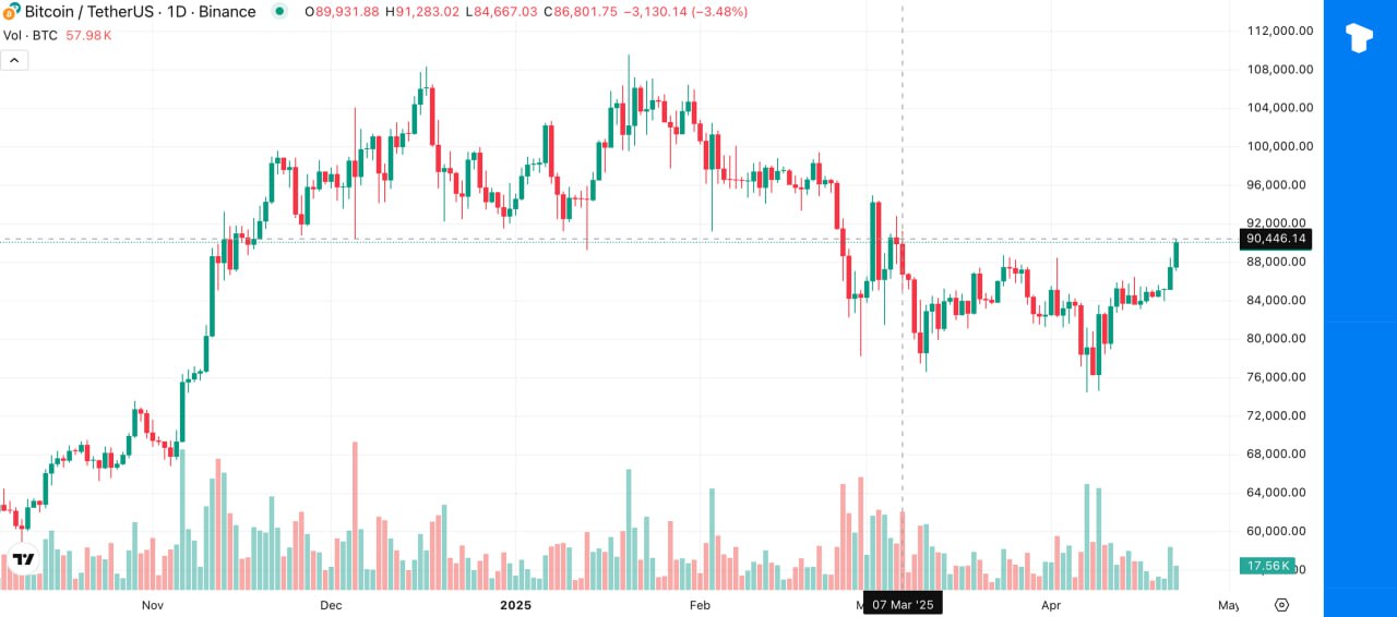 It took 46 days for Bitcoin to reclaim the $90k level, last seen on March 7, 2025.