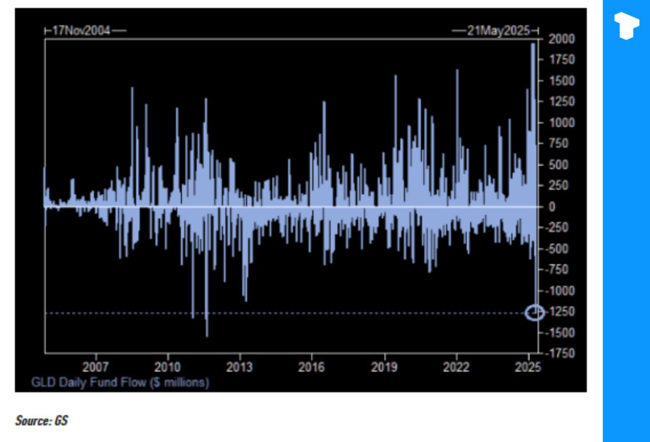 全球最大的黄金 ETF GLD 在 2025 年 4 月 22 日出现 13 亿美元的资金流出,这是自 2011 年以来最大的单日资金流出量,因为在贸易紧张局势缓解的情况下,投资者转向股市。