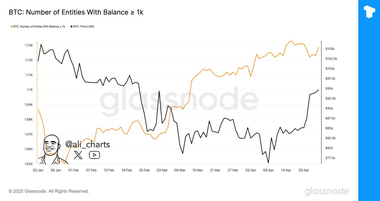 The number of entities holding at least 1,000 BTC increased by nearly 100 since late January