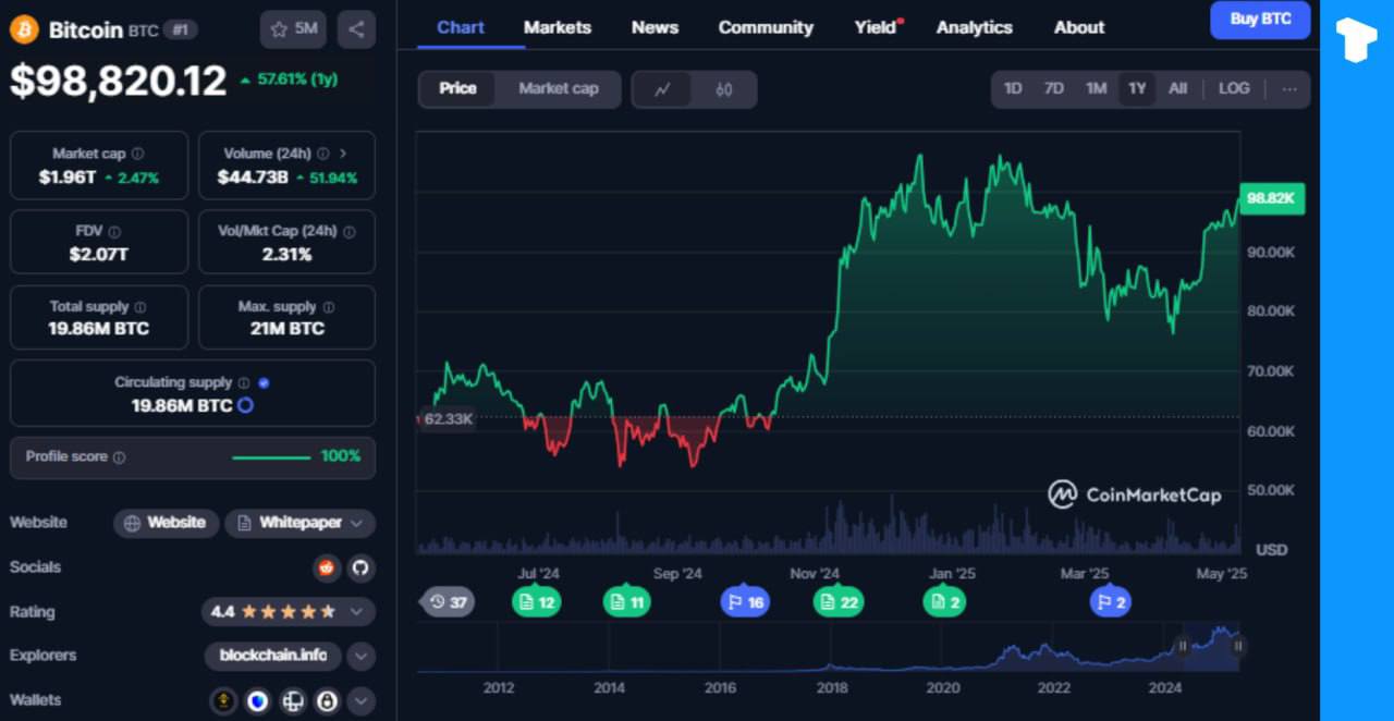 比特币飙升至 99,000 美元,为 2025 年 2 月 4 日以来的最高水平,目前仅比其历史高点 109,114.88 美元低约 10%。
