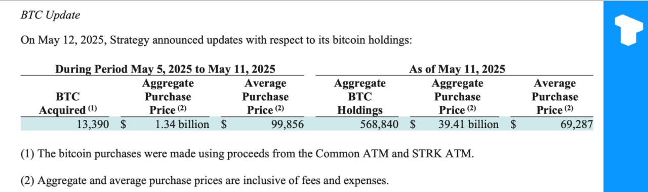 截至 2025 年 5 月 12 日,该公司持有 568,840 个 BTC,总价值 394.1 亿美元,平均成本为每枚比特币 69,287 美元。