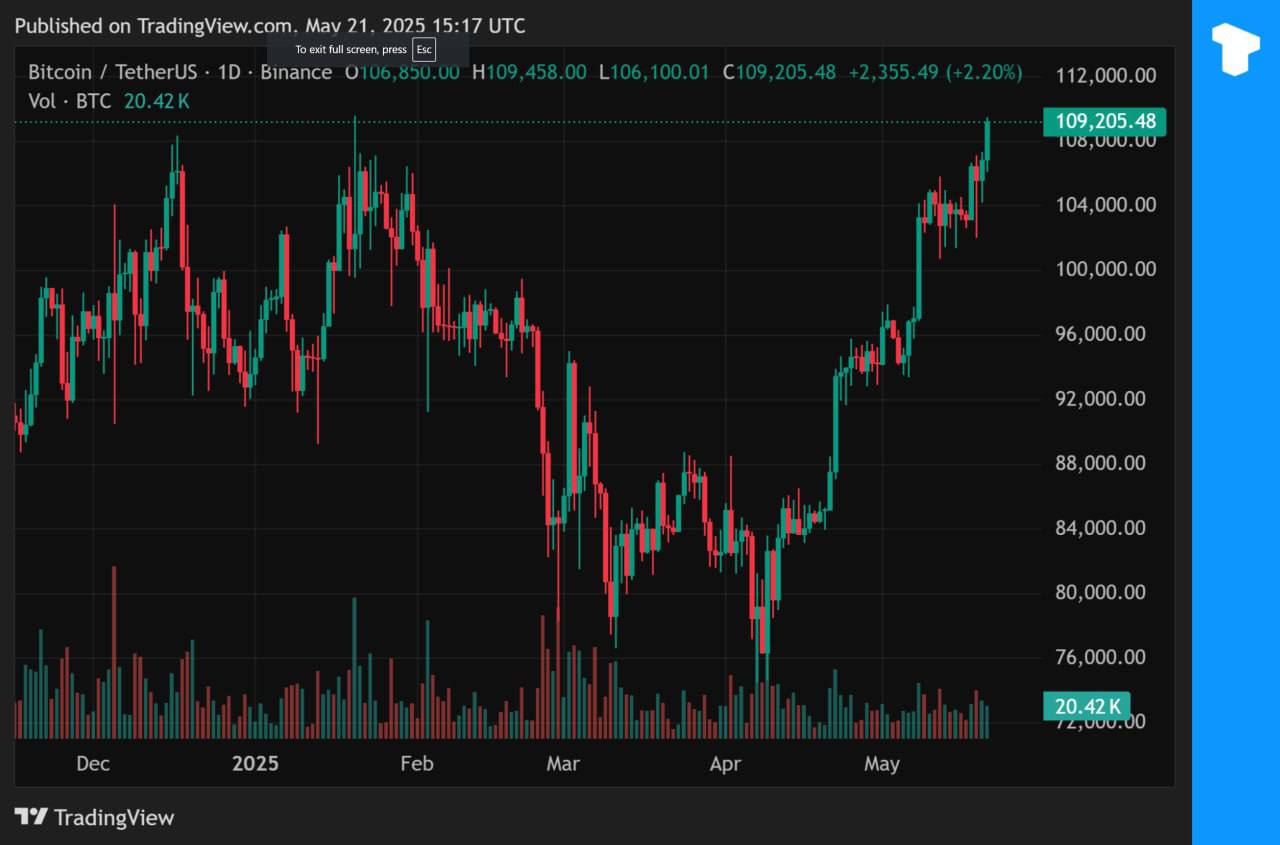 比特币价格创下 109,424 美元的历史新高,目前 99% 的持有者都获利了结。