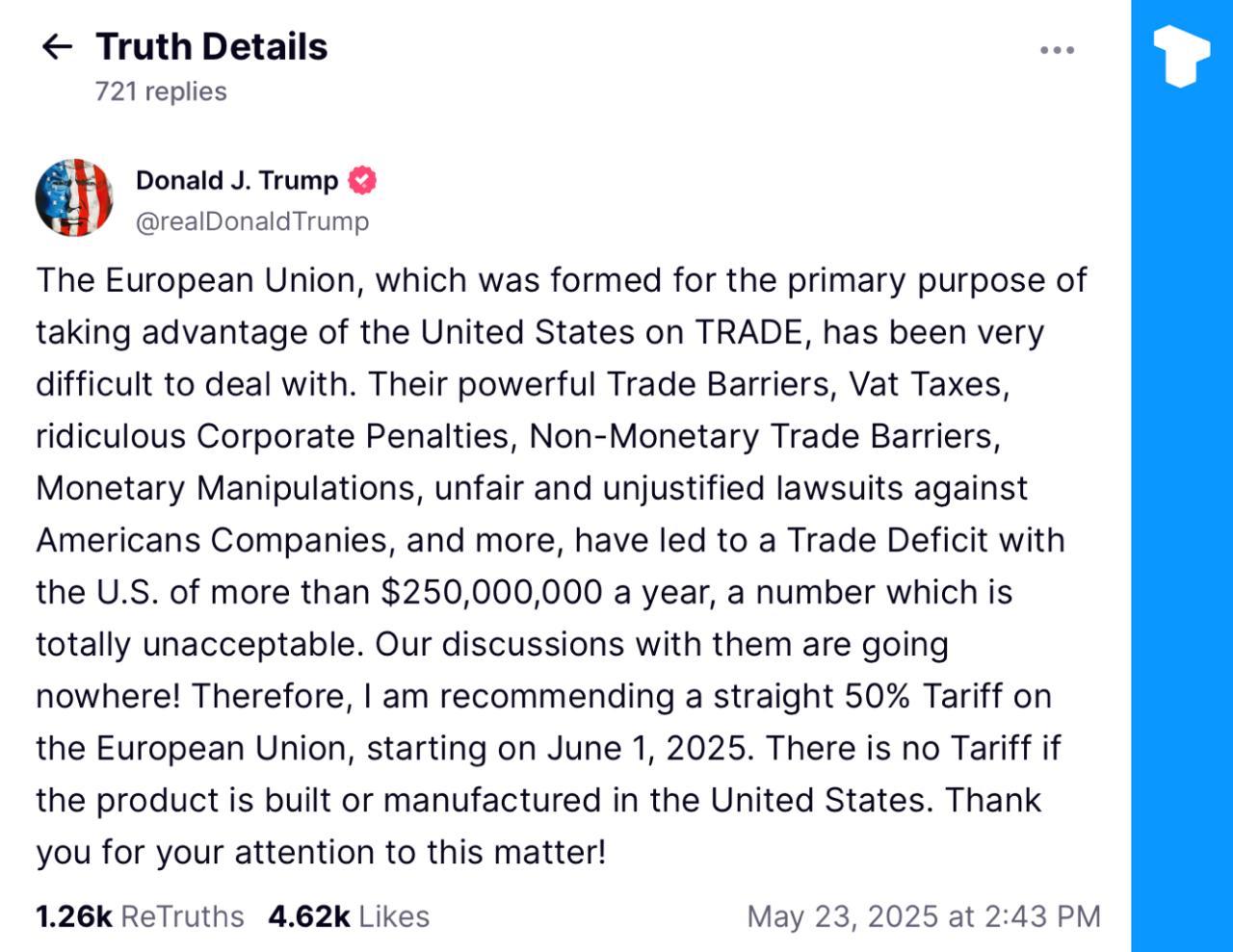唐纳德·特朗普在 Truth Social 上宣布,他建议从 6 月 1 日起对来自欧盟的商品征收 50% 的关税