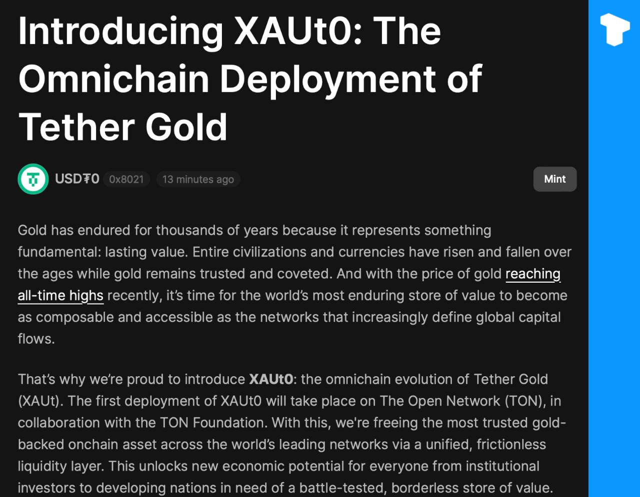 Tether has announced the launch of XAUt0, a new version of the Tether Gold (XAUt) token designed for the omnichain ecosystem. The token will initially debut on the TON blockchain.