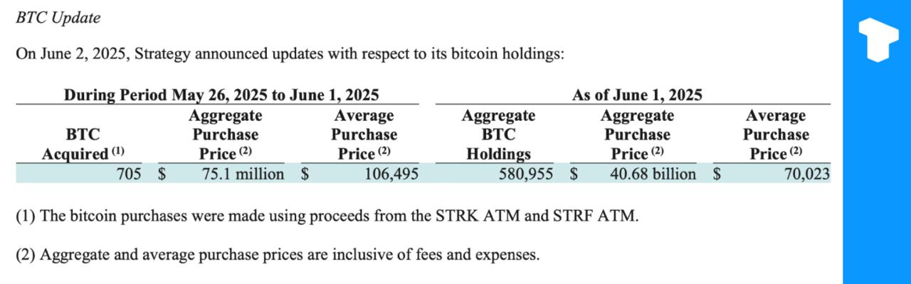 截至 6 月 2 日,该公司持有 580,955 枚 BTC,购买价格约为 406.8 亿美元,平均每枚 BTC 价格约为 70,023 美元。
