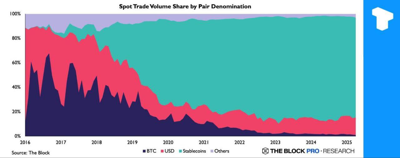 Stablecoins now dominate crypto spot markets, making up over 80% of total spot trading volume in 2025.