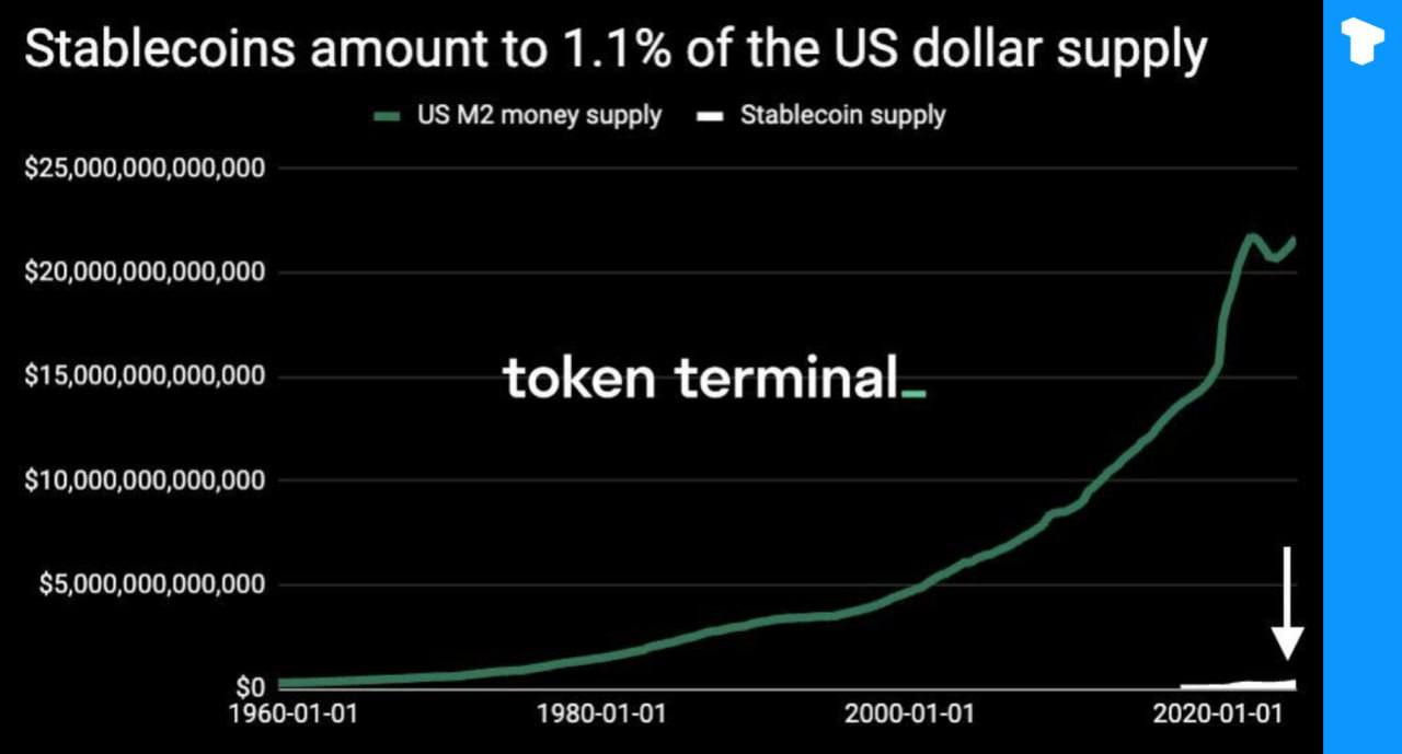 稳定币目前占美元总供应量的 1.1%,高于 2020 年初的 0.2%,凸显了其在全球流动性和金融流动中日益增长的作用。