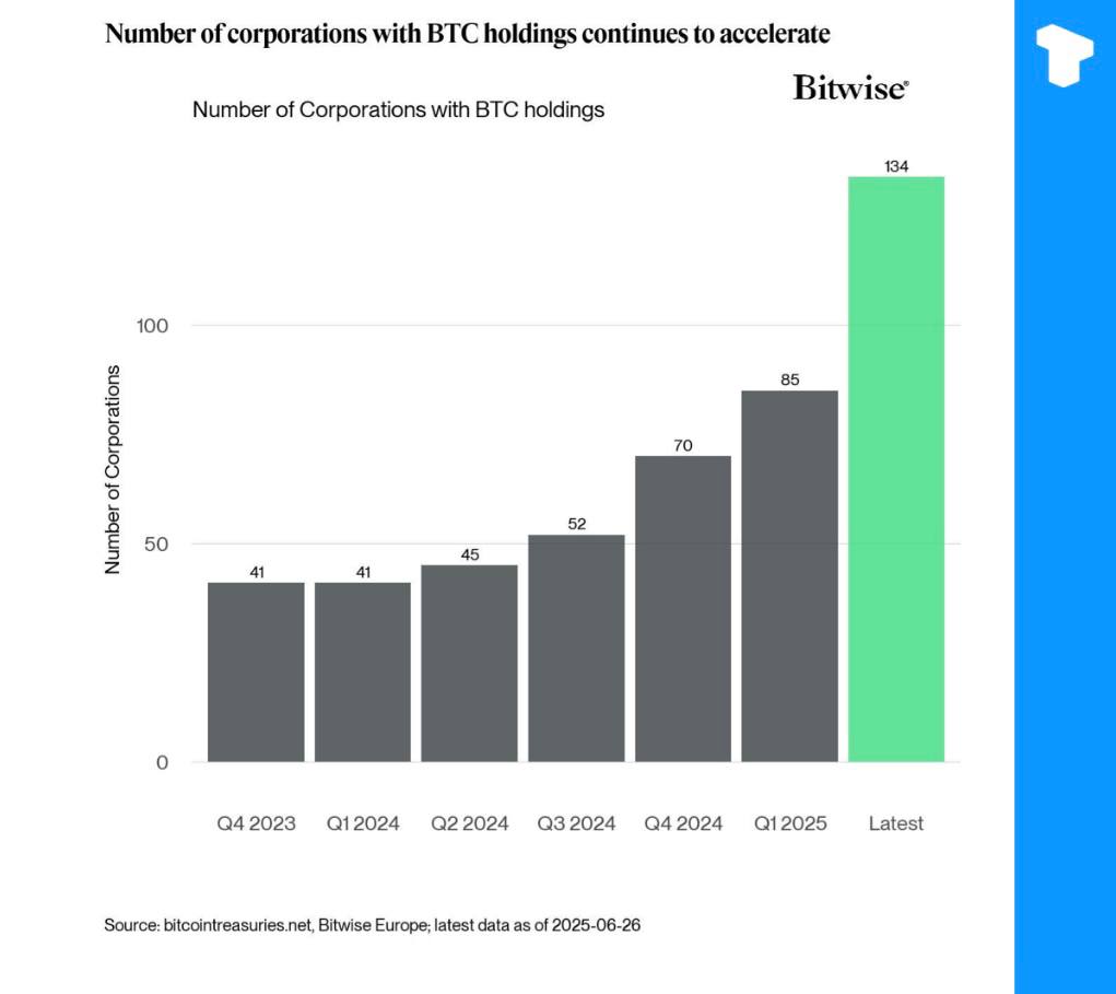 Corporations are accelerating their Bitcoin purchases, with the number of companies holding BTC rising from 85 at the end of 2024 to 134 by June 2025—a new record.