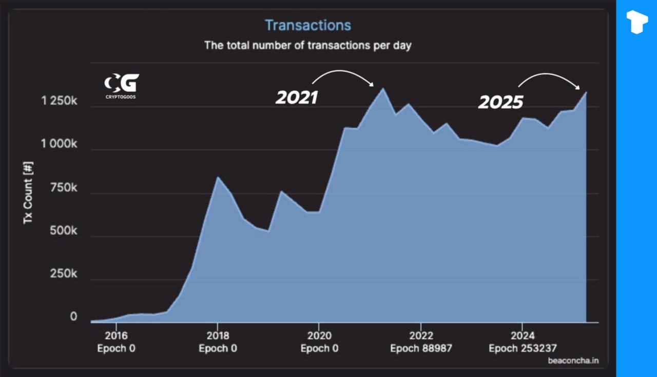 Daily transactions on Ethereum are approaching all-time highs, marking the first return to 2021 levels, surpassing 1.25m transactions per day.