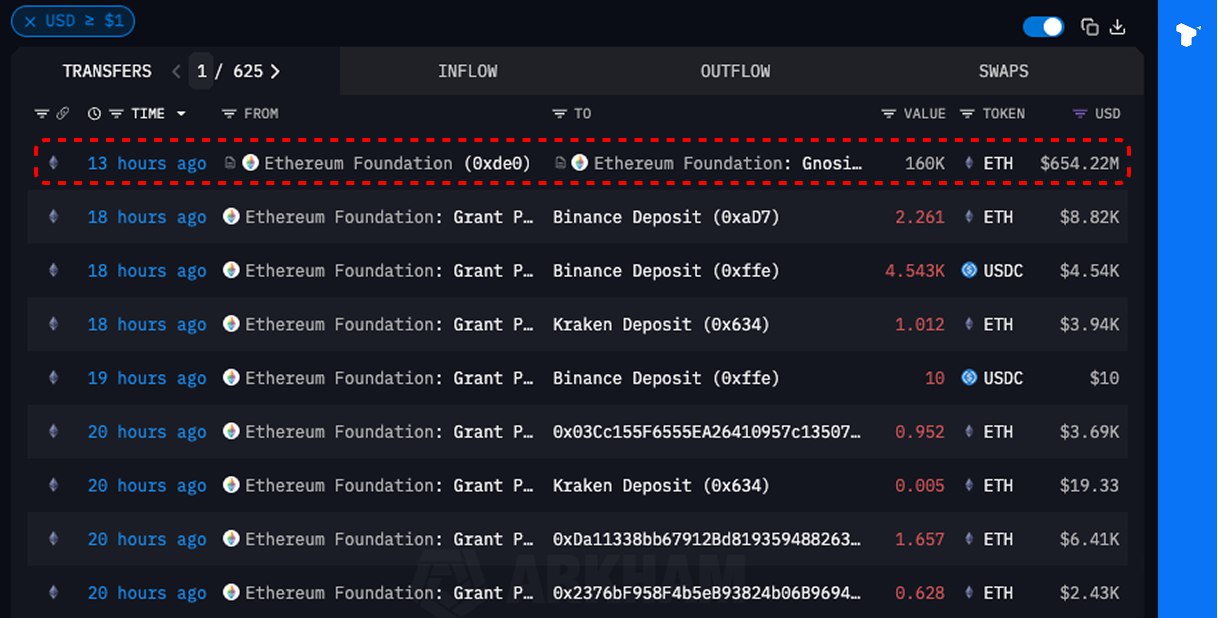 Analytics firm Arkham reported that the Foundation sent 160,000 ETH (about $654 million) to a wallet previously used for sales.
