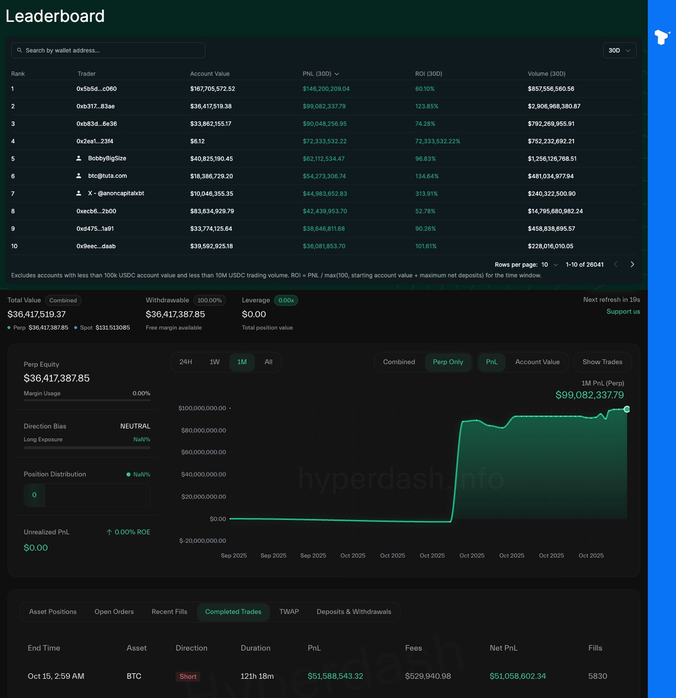 他目前在 Hyperliquid 排行榜上位居第2名,PNL 为 9900 万美元。