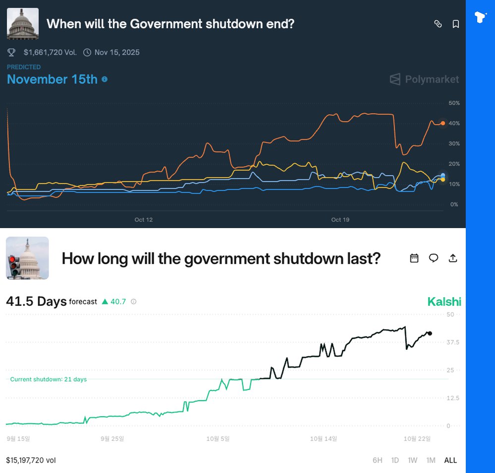 Polymarket points to an end around November 15, while Kalshi indicates an average of 41.6 days (November 11).