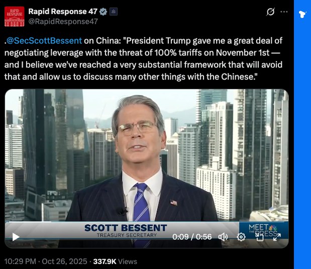 U.S. Treasury Secretary Scott Bessent said that the U.S. and China have made ‘substantial progress’ in the basic framework of a trade agreement.