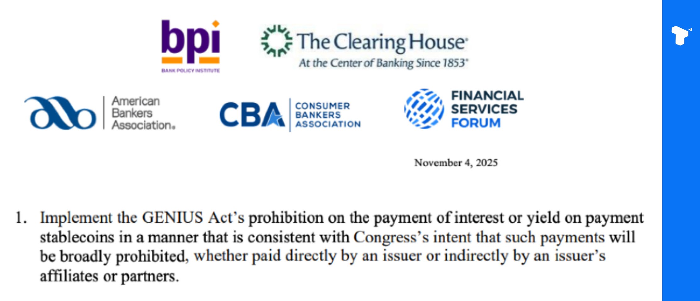 Coinbase 主张,利息支付禁令应仅适用于发行方;而银行业协会则呼吁实施一项全面的利息禁令,将交易所及其关联方也纳入其中,并警告银行存款外流的风险。