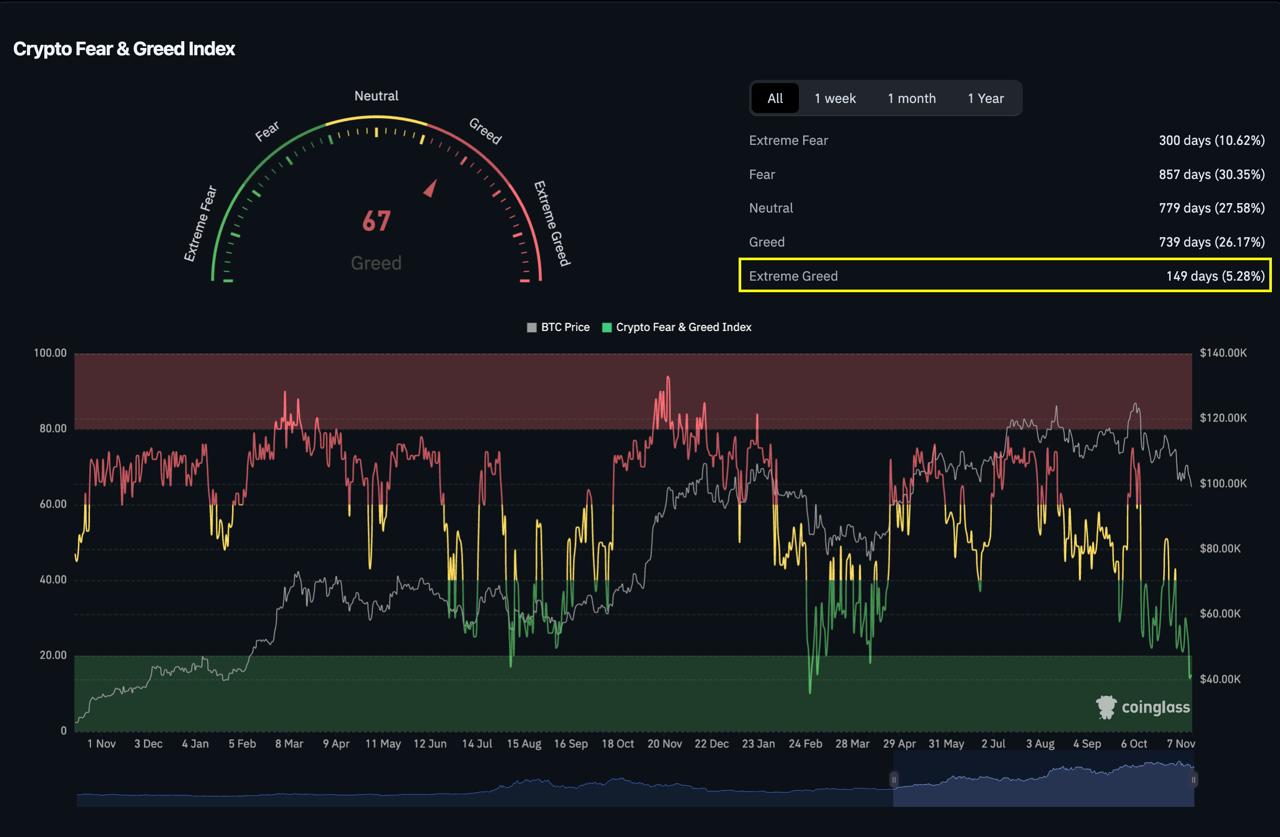 由于昨天的下跌,加密货币市场的恐慌与贪婪指数已进入极端恐慌阶段。 这是自 2018 年以来仅出现约 5% 的恐慌区间。 2024 年 8 月以及 2025 年 2 月和 4 月进入极端恐慌阶段时,市场触底反弹。