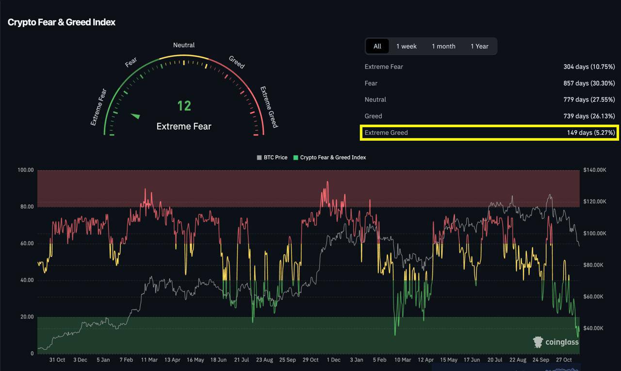 在加密货币市场历史上,包括这次在内,处于极端恐慌阶段的日子总共有 304 天 (约占 10%)